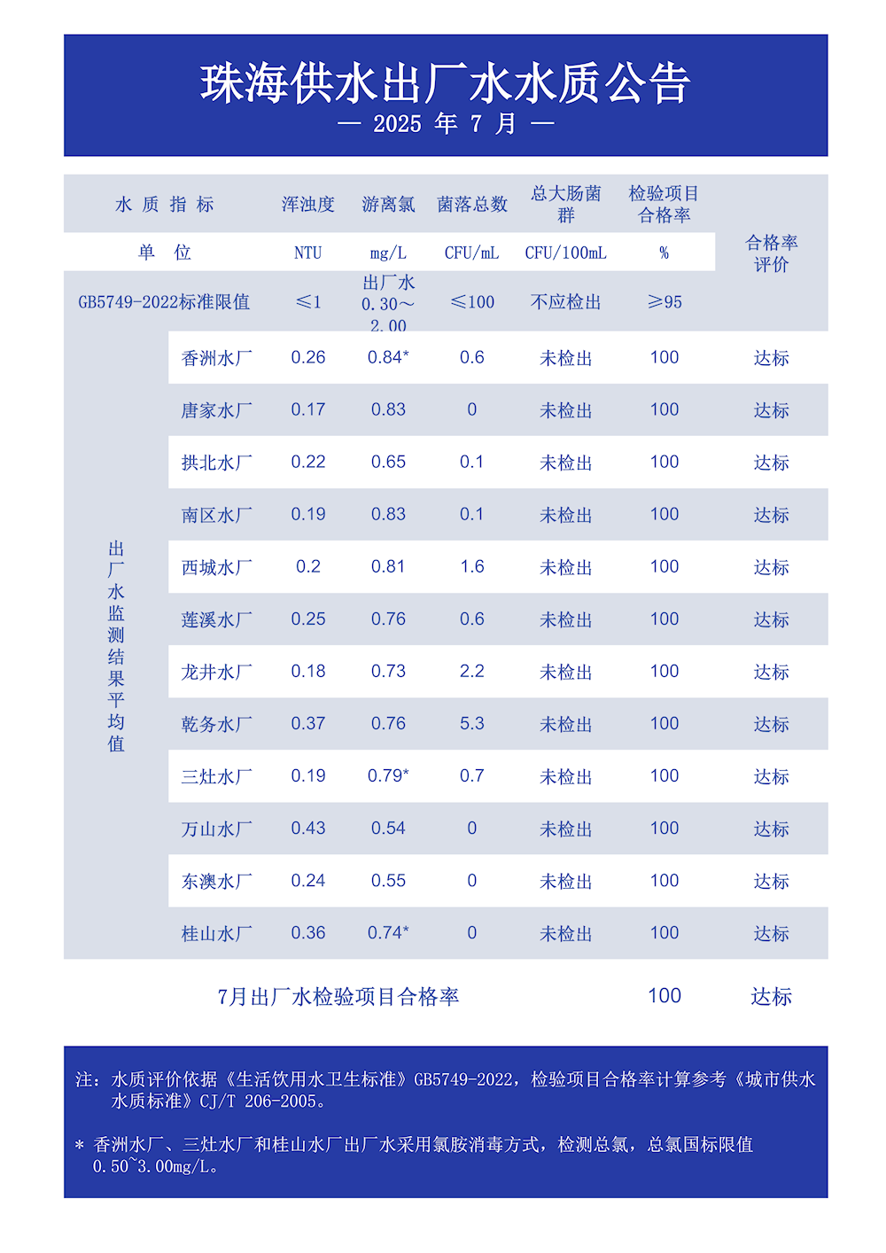 2025年7月珠海供水出廠水水質(zhì)公告 發(fā)布時(shí)間:2025年08月13日 瀏覽次數(shù): 次 小大 原文下載: 2025年7月珠海供水出廠水水質(zhì)公告.doc 【打印正文】