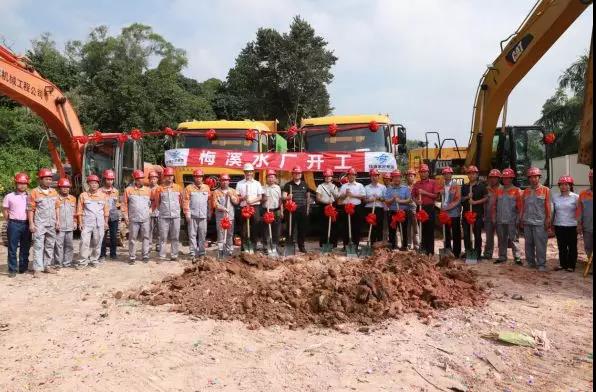來自珠海市水務局、珠海水控集團及珠海市工程監理有限公司等相關單位的代表出席梅溪水廠工程開工儀式。宣布工程正式開工后,各單位代表共同為工程奠基。