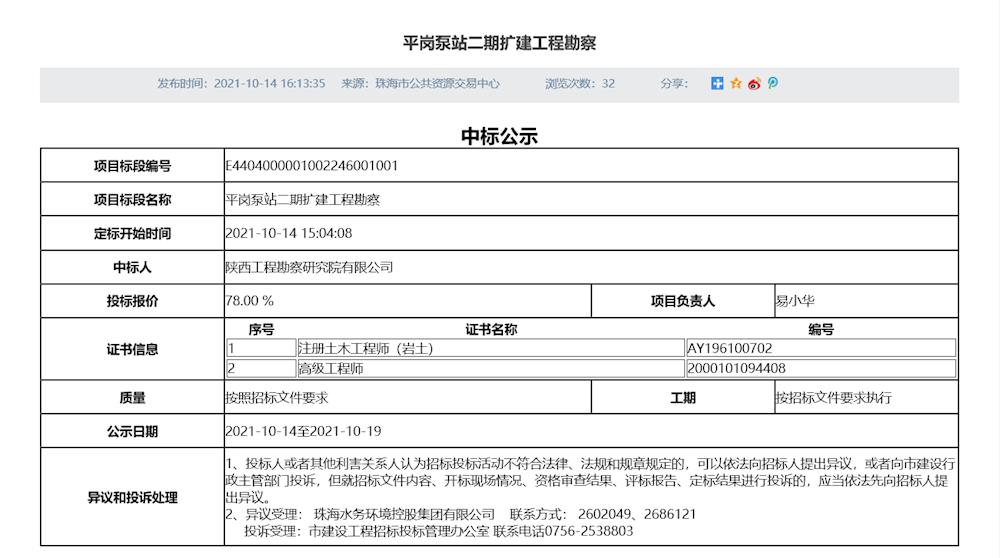 平崗泵站二期擴(kuò)建工程勘察項(xiàng)目中標(biāo)公示